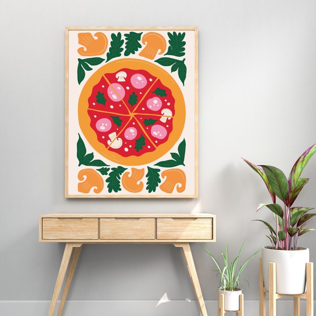 Celebrate classic Italian flavors with this pizza kitchen wall art print. Featuring a vibrant illustrated pizza topped with mushrooms, herbs, and fresh ingredients, this modern food poster brings warmth and personality to your kitchen or dining space.